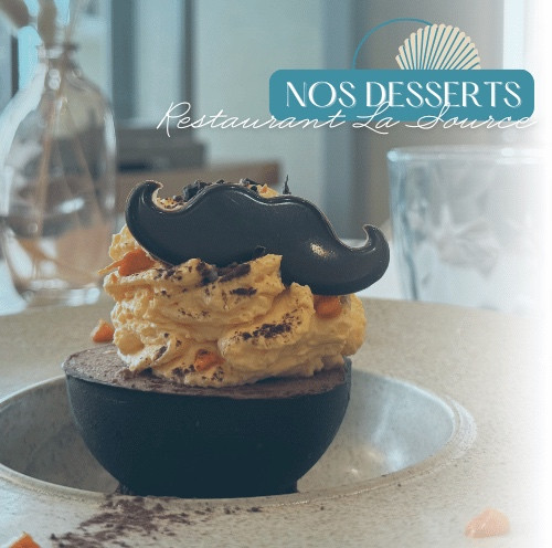 Nos desserts s'habillent eux aussi de symbole : une pièce en chocolat en forme de moustache vient accompagner vos douceurs au Restaurant La Source.